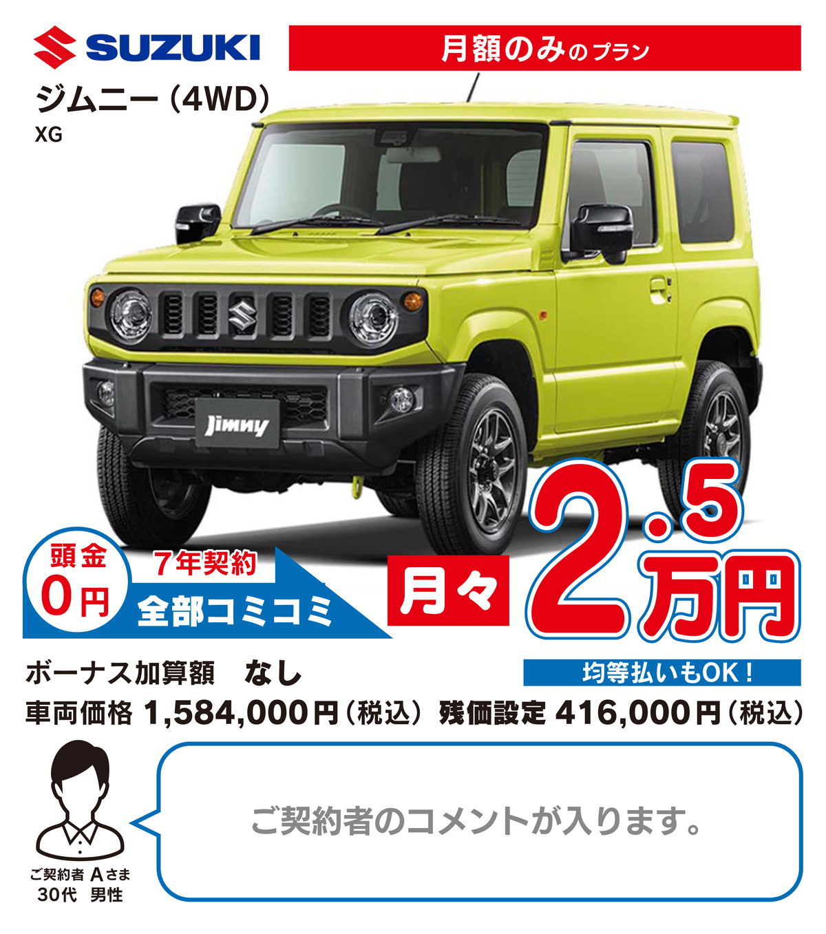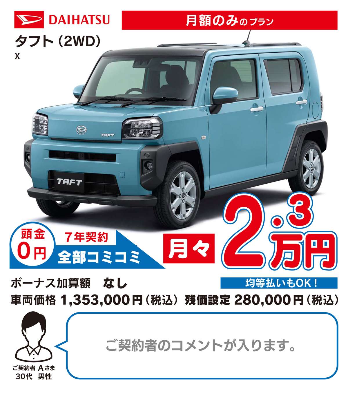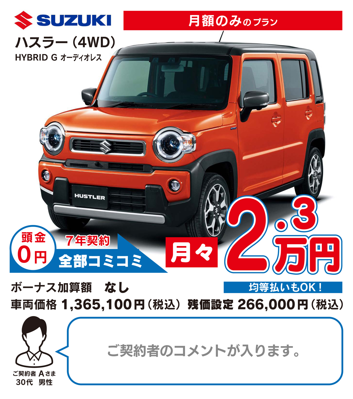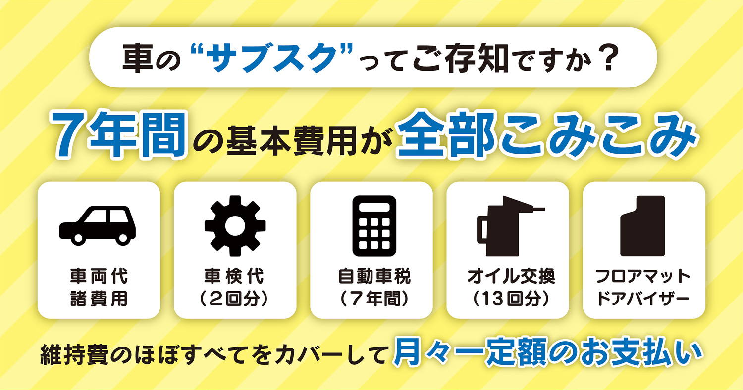 はい、国産の全メーカー、全車種の取り扱いが可能です。普通車は車体価格や税金などのランニングコストの関係で月々2万円〜(税込・別途ボーナス払い)からのお取り扱いとなります。