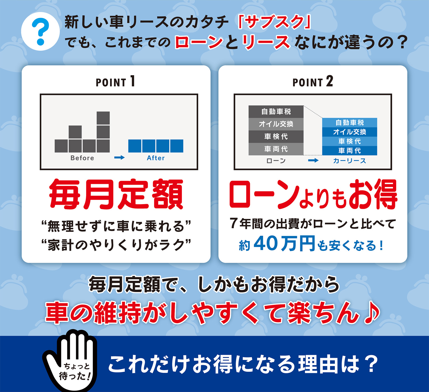 リース・低金利ローン・残価設定ローンなど、お客様の生活スタイルに最適なお支払い方法をご提案します。特に新車は超低金利1.9%を採用し、一般的な販売店の金利と比較して支払額が月々5,000円以上お安くなります!